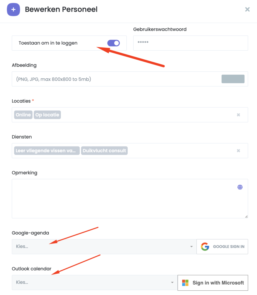 Bij Teammedewerker kan je je medewerkers toevoegen. Het is doorgaans het makkelijkst om je medewerkers toe te staan om in te loggen in hun eigen account. Ze kunnen dan zelf hun Google of Outlook agenda koppelen. Als ze inloggen dan kunnen ze alleen bij hun eigen gegevens en afspraken.